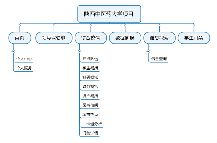 陕西中医药大学数据分析平台项目,涉及内容包括Ebpay、领导驾驶舱、综合校情、数据简报、信息探索和学生门禁等各项内容。平台项目功能架构图如下: