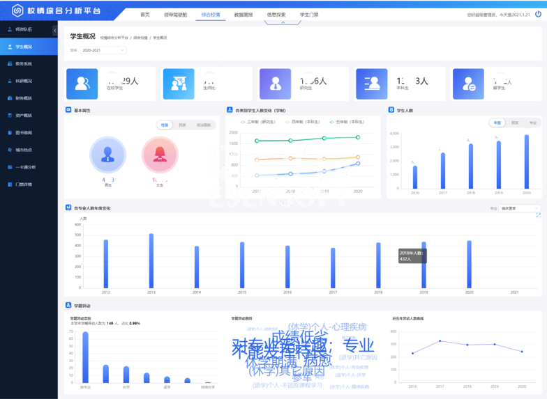 学生概括展现出学生的基本属性、人数分布、学籍情况、借阅与消费、毕业与就业等指标。如下图: