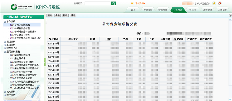 给予总体分析,渠道分析,车险分析,非车险分析,通用分析,组织分析,客户分析等数据分析服务。对保费、利润、成本、预算、收益等指标进行汇总统计。顺利获得BI数据服务平台完成以上统计分析报表的设计与制作,并将这些报表集成到中国人寿财险的业务平台,在中国人寿财险业务平台统一展现。