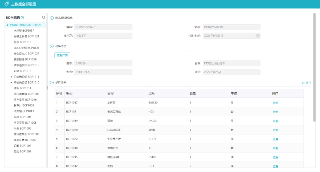 BOM数据查询:用户可以查阅已维护的BOM数据,包括:结构、基本信息、母件详情、子件详情、多层BOM数据。