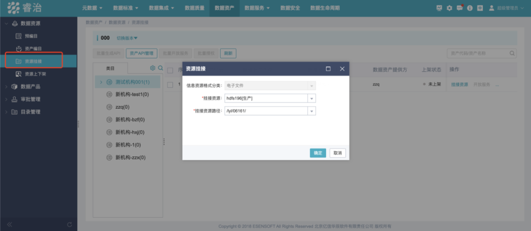 兼容HDFS,数据资产编目、数据资源挂接、添加数据资产上传文件、智能编目都支持选择HDFS类型资源。