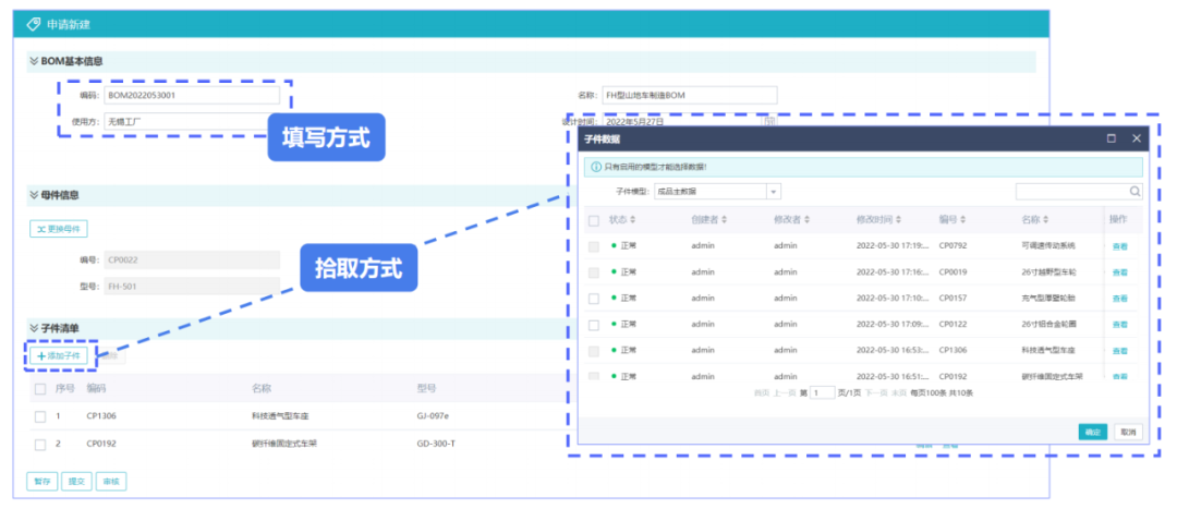 BOM数据创建:用户可以顺利获得填写、拾取的方式,对BOM的基本信息、母件信息、子件清单信息中的数据进行维护。