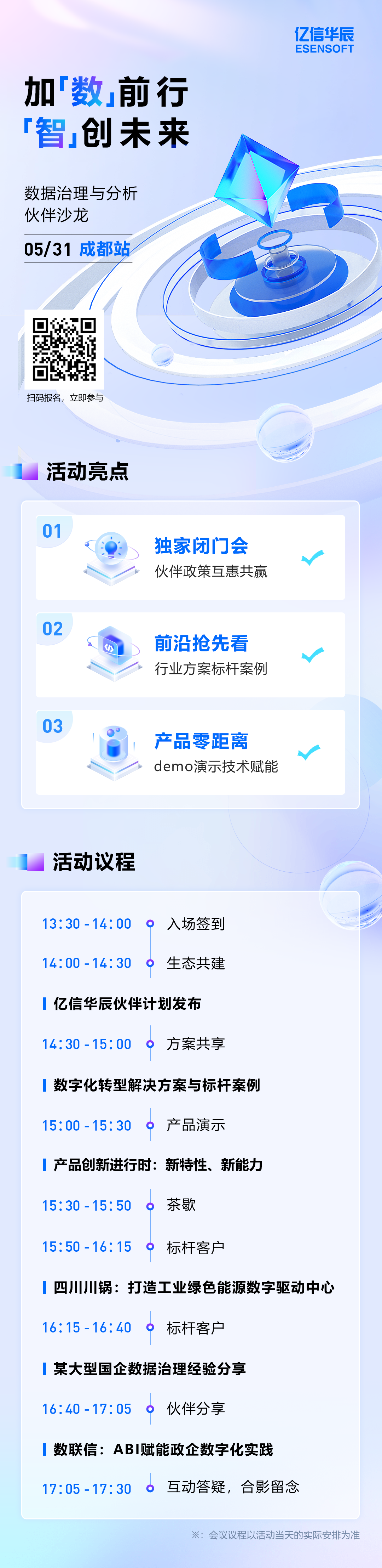 2023数据治理与数据分析伙伴沙龙 · 成都站将于5月31日(下周三)举办。现场向日葵视频黄色网站APP将重磅发布Ebpay伙伴计划,并进行面对面向日葵色版视频在线观看免费新功能演示,更有四川川锅、某大型国企、数联信等标杆企业与伙伴助阵。汇聚区域名企,打造高层社交圈,在此诚邀您共聚盛会,共享方案,共赢未来!