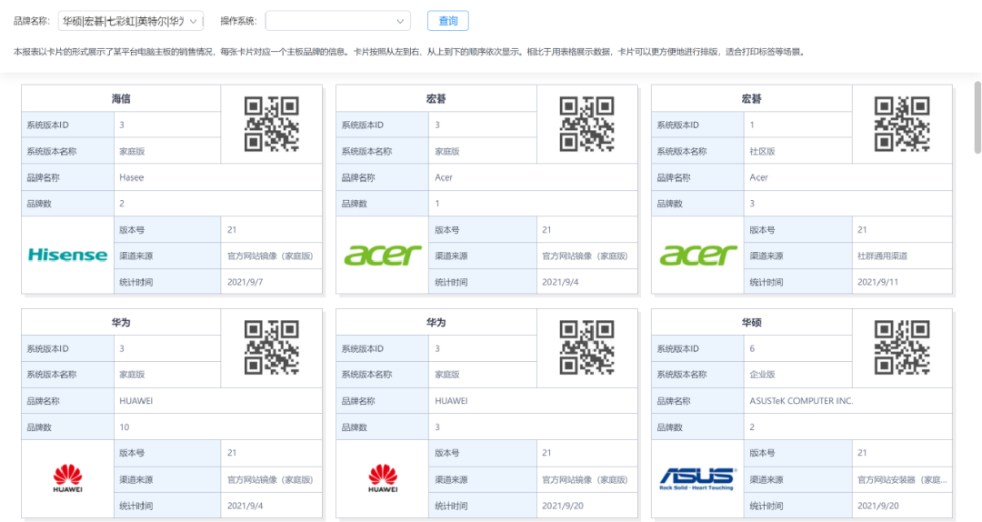 用于分卡片块展示数据,一个卡片块可以展示一条数据,也可以展示多条数据。卡片样式可自由构建,下图报表以卡片的形式展示了某平台电脑主板的销售信息,每张卡片对应一个主板品牌的信息。相比于用表格展示数据,卡片可以更方便地进行排版,适合制造业打印标签等场景。