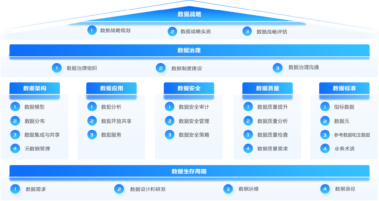 一整套完善的方法论体系:基于DCMM和DAMA数据管理体系,沉淀出成熟、完善且实用的数据管理方法论框架,从指导企业明确自身在数据管理方面的战略目标,到现状分析评估,再基于现状做体系规划,用工具实现规划中的各平台建设,保证实施落地,最后为企业培训,实现知识转移。