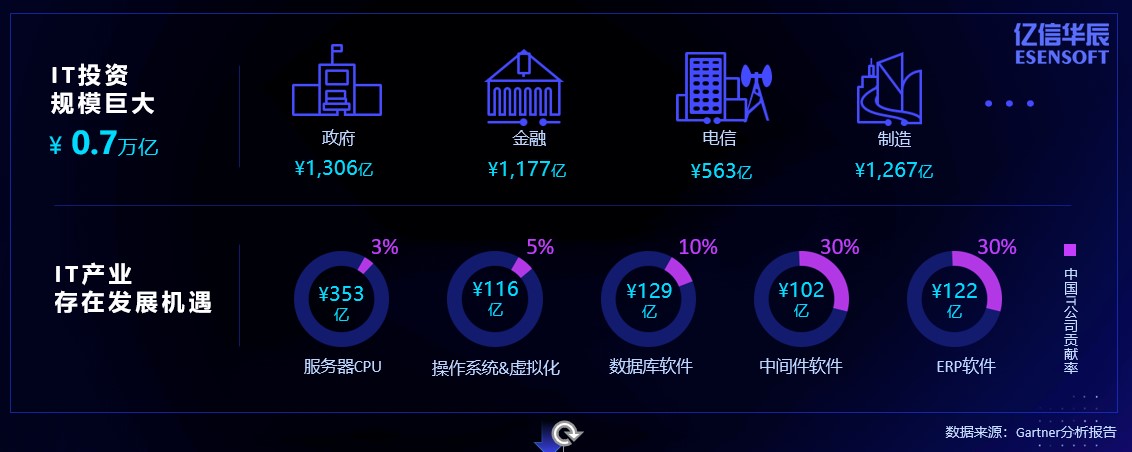 中国IT市场的贡献率很低,大头还是被国外厂商所占领,国内的IT投资规模却是巨大的,潜力无限。