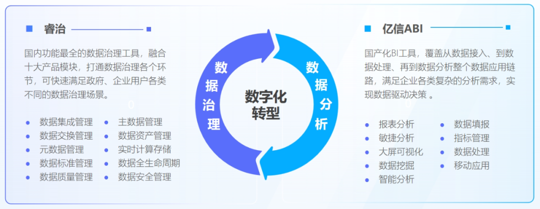 亿信ABI是自主研发融合了ETL数据处理、数据建模、数据可视化、数据分析、数据填报、移动应用等核心功能而打造的全能型