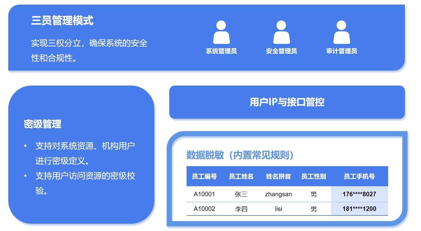1.支持三权分立、密级管理