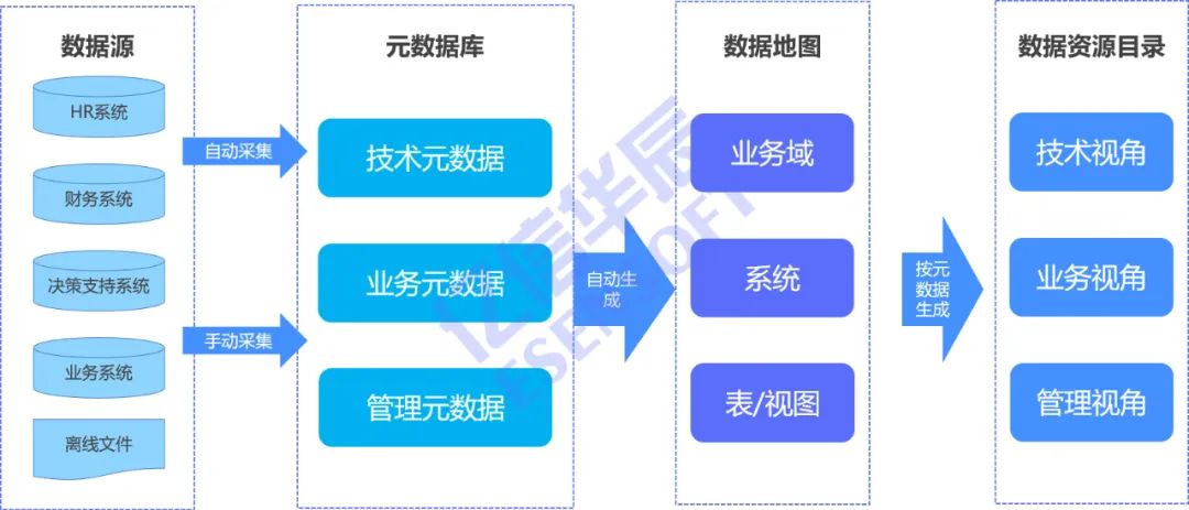 另一方面结合技术视角自下而上归纳(需要用到技术元数据,对数据的存储分布、血缘关系等进行描述),并顺利获得建立目录中数据项与系统信息项的映射关系,保证每个数据资产项对应可以在真实的信息系统中查找到。