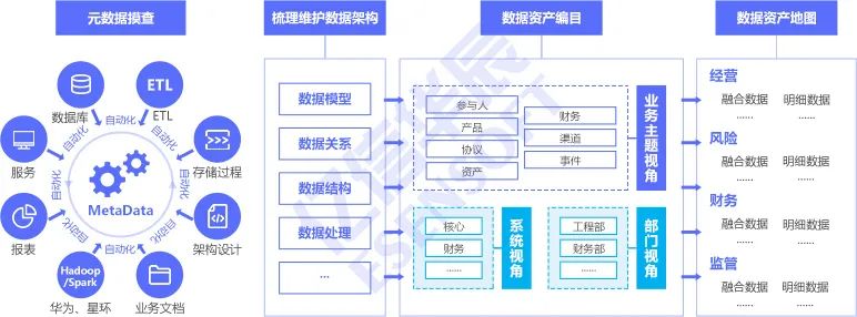 先定义数据资产,配置数据资产属性。再顺利获得对接企业业务系统、数据湖或者数据仓库,采集元数据自动获取原始的企业数据字典及数据之间的关系,形成企业元数据地图。