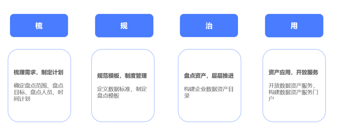 以盘清家底为根基,梳理分类、规范管理、根治问题、持续应用为目标,构建业务系统数据资源目录,发布数据标准,有效推进数据资源共享和应用,数据资产盘点一般可分为“梳、规、盘、用”四大流程。