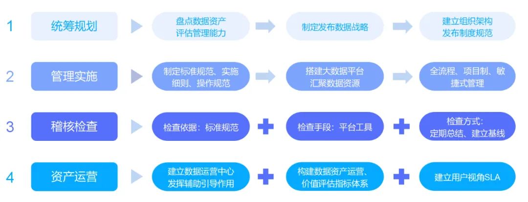 第一步是制定企业级数据资产标准规范体系,建立各活动职能的实施细则与操作规范。