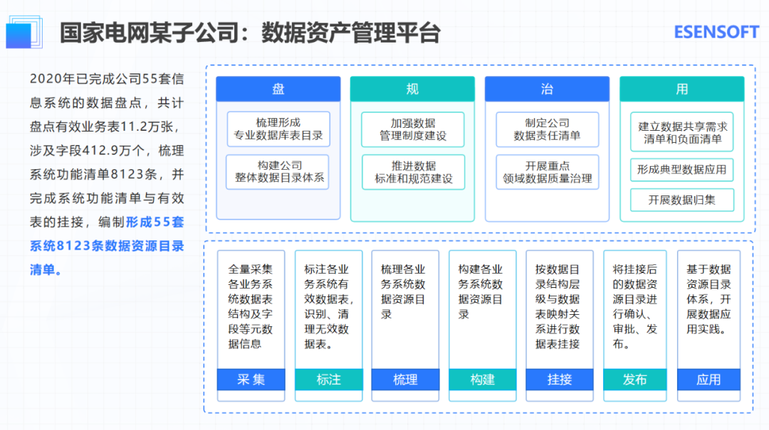 Ebpay大数据资产管理方案已成功应用于时代中国、山东临沂矿业集团、国家电网等企业,搭建数据资产管理平台,编制形成数据资产目录,实现数据资产开放共享。