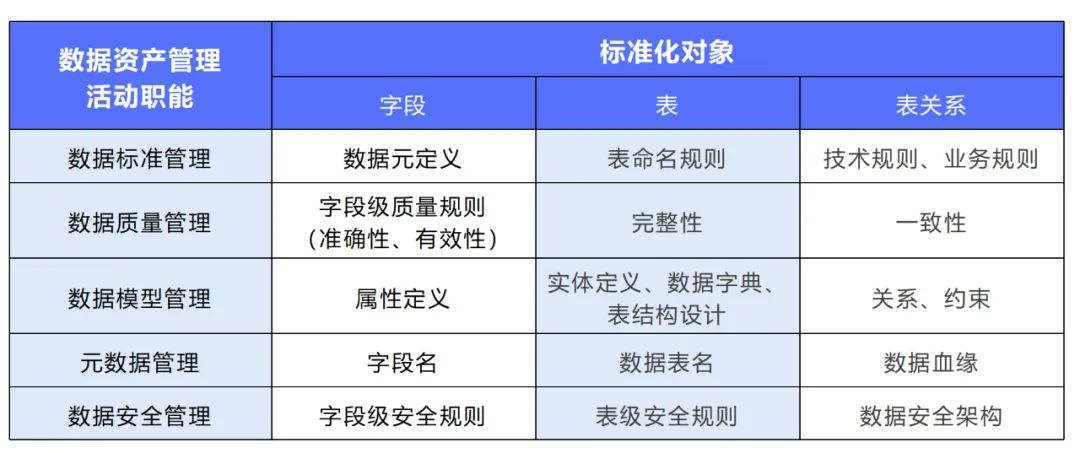 企业级数据资产标准规范体系指各活动职能下对数据技术设计、业务含义的标准化。以结构化数据为例,标准化的对象包括字段、表以及表间关系,对于各对象的标准化内容如下图所示。此外,结合数据资产管理相关管理办法,形成各活动职能的实施细则、操作规范,为数据资产管理的有效执行奠定良好基础。