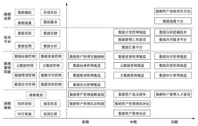 在面向价值实现的数据资产管理体系的基础上,企业召开数据资产管理通常分为前期、中期和后期3个阶段,各阶段在保障措施、数据管理职能、技术平台和数据运营方面的侧重点和产出物有所不同,以确保企业统筹规划数据资产管理,有序推进数据资产管理工作,逐步释放数据资产价值。