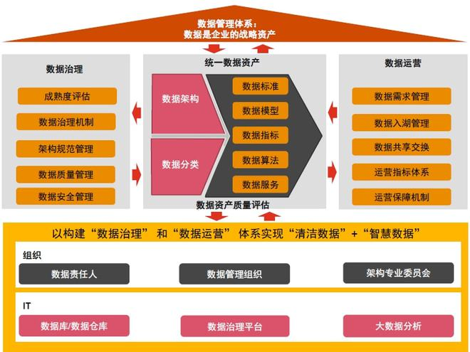 (1)数据治理,包含:企业数据战略、治理组织人才、规范业务流程,为数据驱动业务运营给予基础保障;