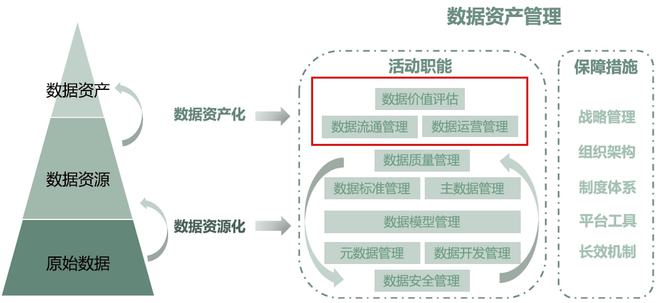 (2)数据资产化。主要以扩大数据资产的应用范围、显性化数据资产的成本与效益为工作重点,并使数据供给端与数据消费端之间形成良性反馈闭环。包括数据资产流通、数据资产运营、数据价值评估等活动职能。