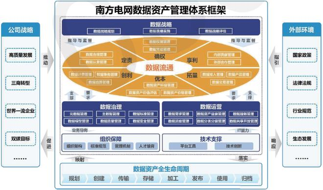 该白皮书提出的数据资产管理体系是以国家政策、法律法规、行业规范、生态开展等外部环境为指引,主要由数据战略、数据治理、数据运营、数据流通、组织保障、技术支撑六个模块共36项管理职能及数据资产全生命周期 8 个环节构成,顺利获得清晰界定各项职能活动的定位和内在联系,相对完整地覆盖了南方电网公司数据资产管理的工作领域。