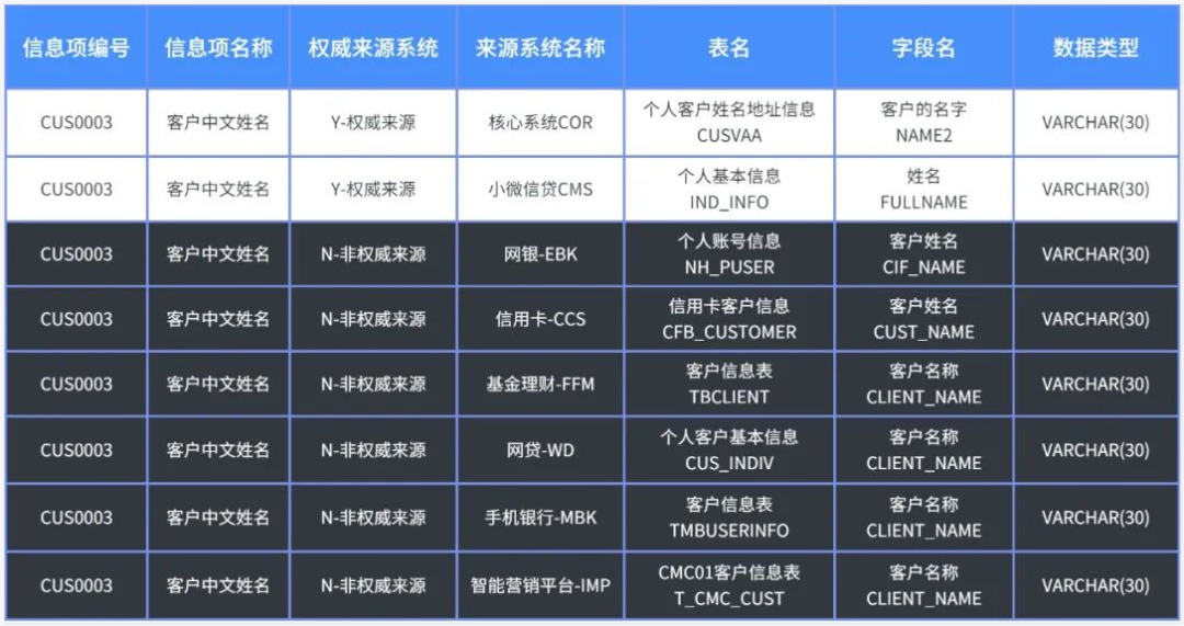 数据采集的基础上,探索信息项所属系统来源,确认其系统分布情况,将数据资产信息项与物理表/字段间构建映射关系,并确定权威数据来源。对于单个业务系统而言,只需要将主表中经过分析最准的内容映射过来,而不是所有表,避免数据使用者因为多表冗余存储造成混淆。