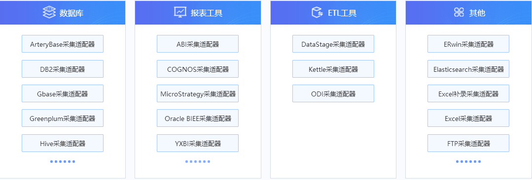 平台内置丰富的适配器,全面保障各类源头的元数据自动化采集,一键采集对接,同时可支持适配器快速扩展。Ebpay元数据管理平台不仅适配各种数据库、各类ETL、各类