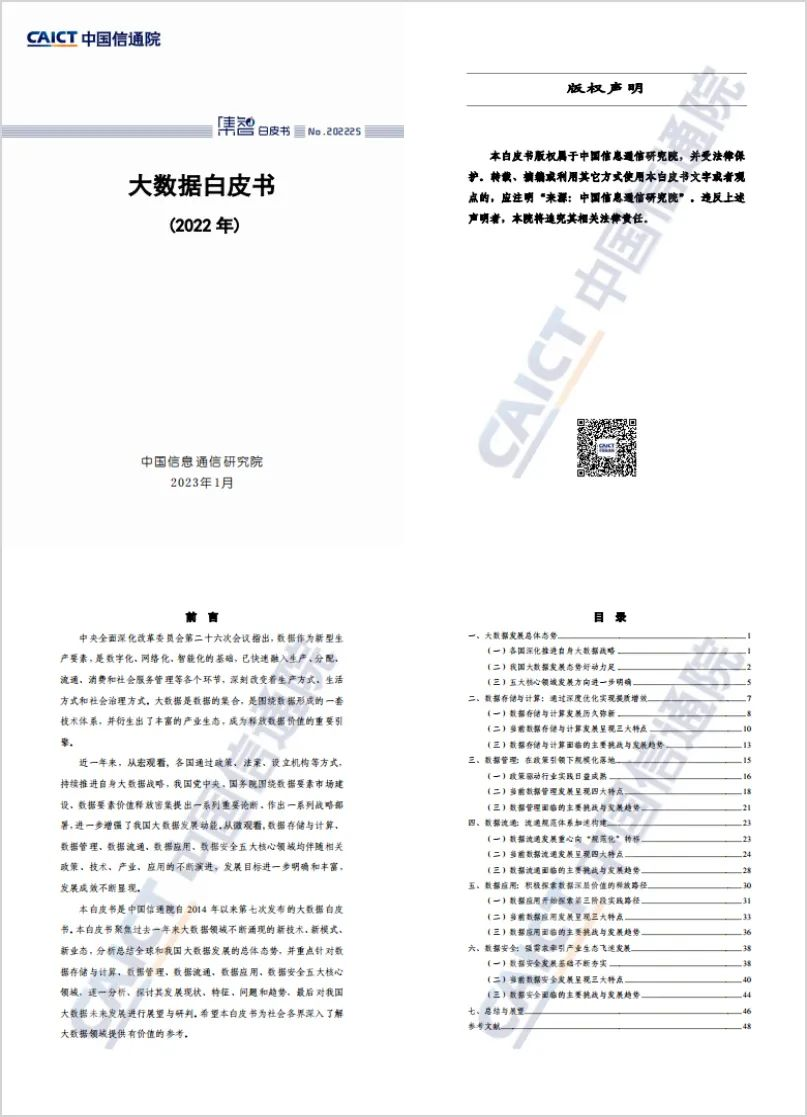 数据价值的重要引擎。《大数据白皮书(2022年)》是中国信通院自2014年以来第七次发布的大数据白皮书。
