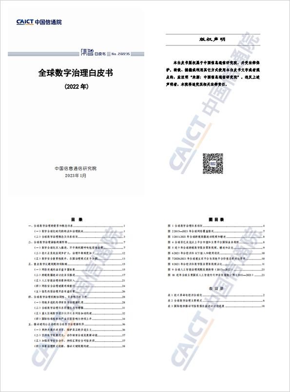 中国信通院陆续在第三年发布《全球数字治理白皮书》。本年度报告在延续以往对全球数字治理核心议题和重要机制进展评估展望的基础上,首次尝试提出全球数字治理的定义和体系框架,并增加了对数字领域安全议题的跟踪分析。