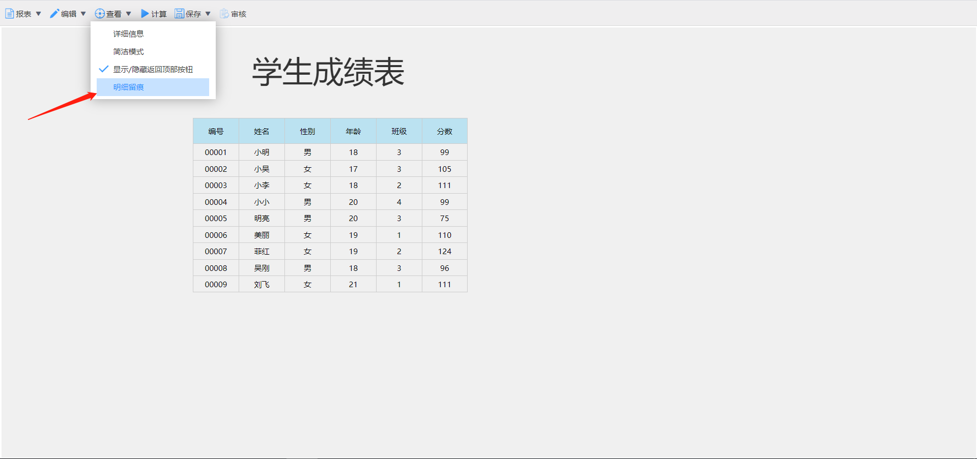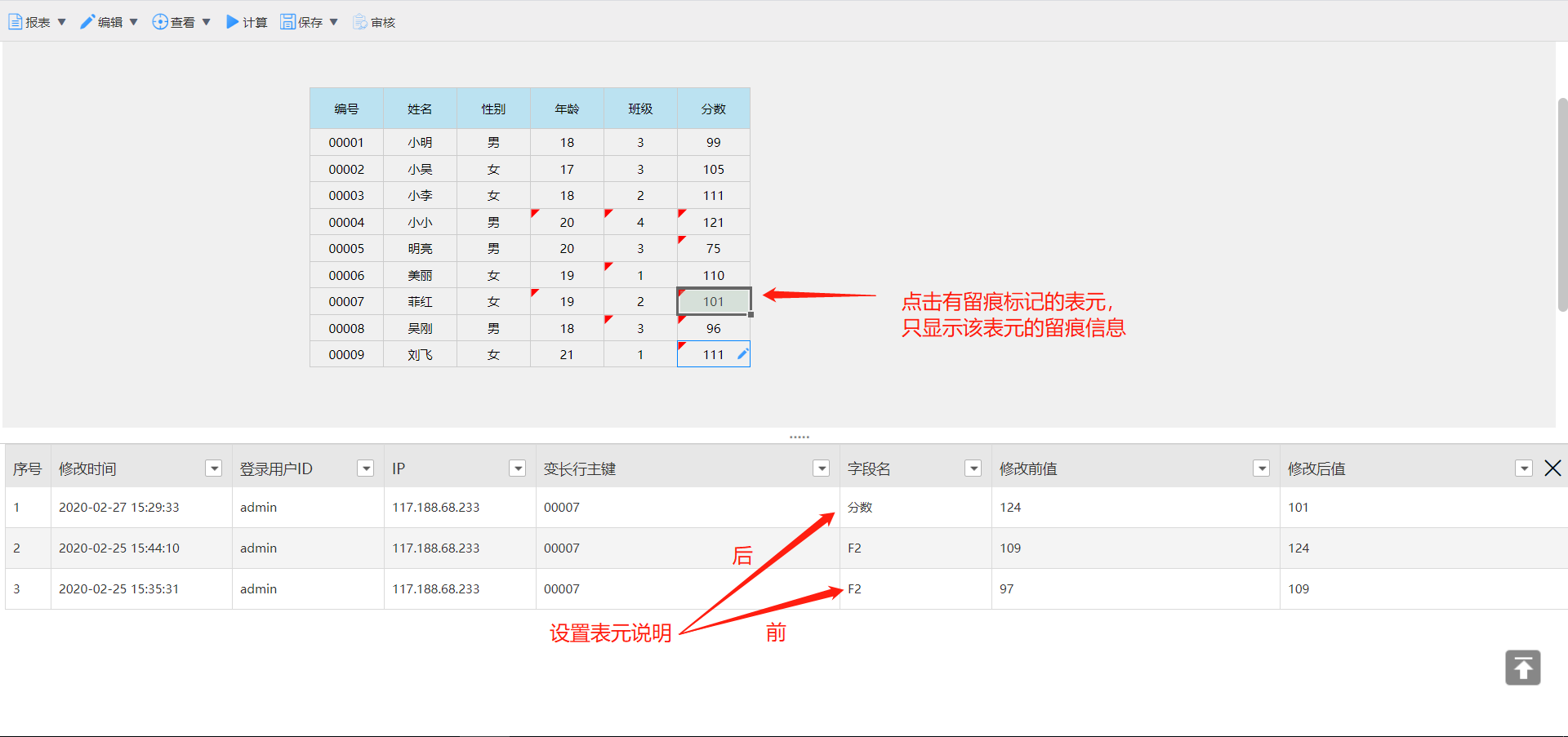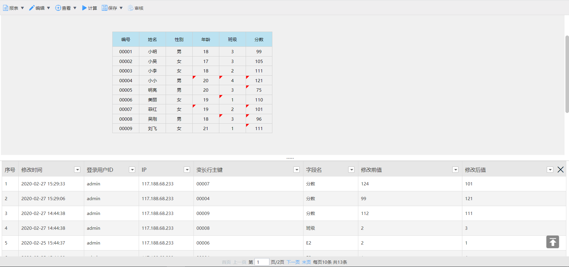 完成以上操作之后,就已经实现了数据留痕功能了,是不是十分的快捷方便,接下来只需点击计算按钮,在数据展现页面对数据进行修改,然后上报之后,点击查看下边的明细留痕菜单,即可查看修改的数据信息。