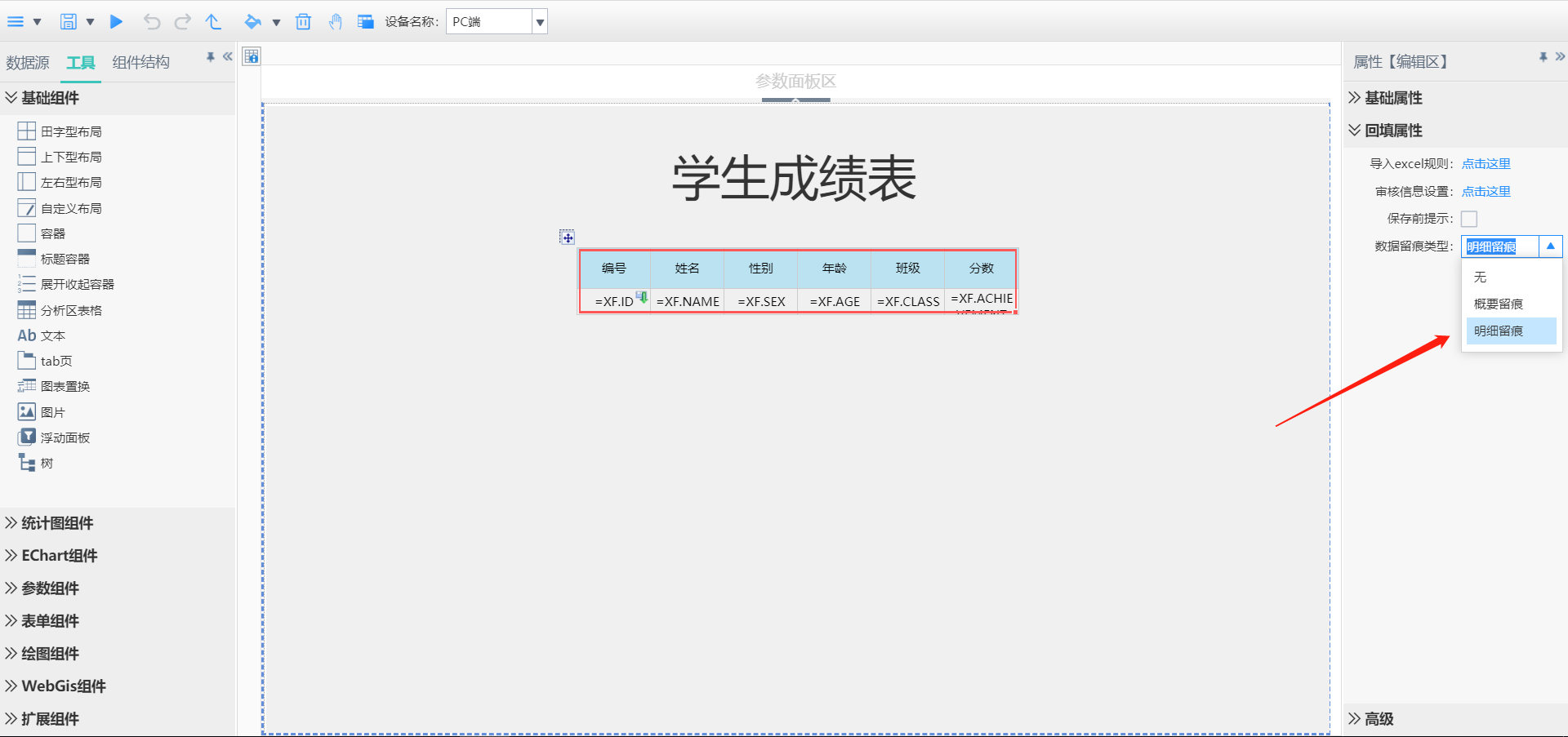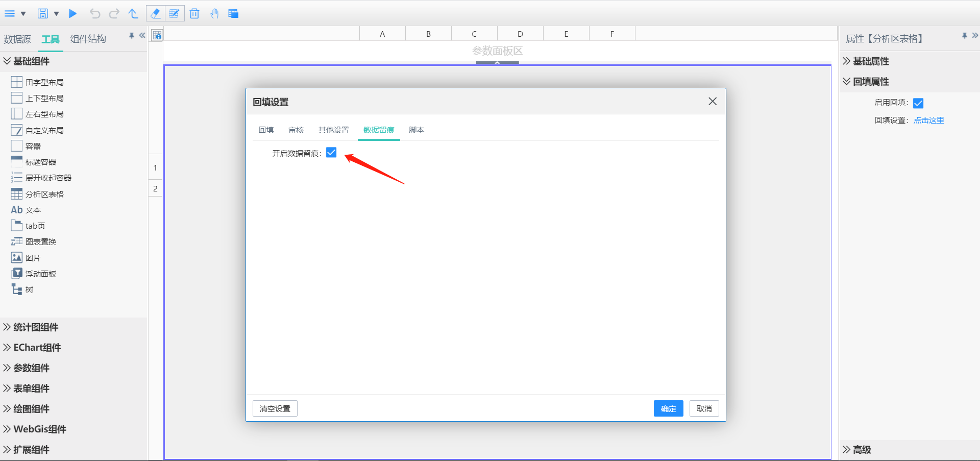 此处以明细留痕为例,选择数据留痕类型为明细留痕,然后打开报表的回填属性面板,设置开启数据留痕。
