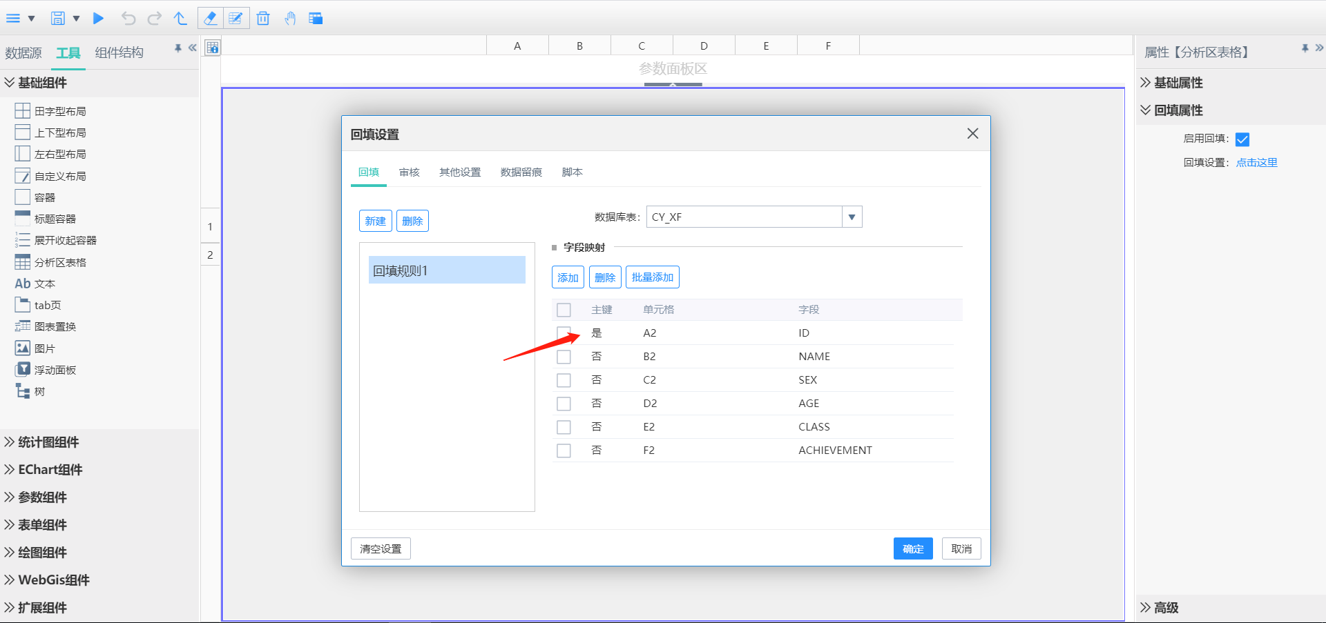 第一时间,打开一张已经设计好的填报报表,数据留痕功能必须要有一个主键字段,在字段映射中设置一个字段为主键,保证记录的数据留痕信息能实现数据的定位功能。