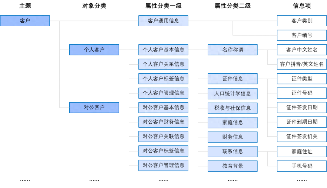 在构建数据资产目录时,需要综合考虑不同的数据资产类型,定义它们的属性,包括业务属性、管理属性、应用模式、资产目录视角等。 这有助于形成企业级数据资产目录,具有权威性、可信性和可用性,并且能够满足各种不同的需求。 以业务领域为例,资产目录可以顺利获得资产清点来梳理银行数据的主题分类和核心业务板块,然后根据业务要素逐步划分二级目录、三级目录,最终达到叶子节点的信息项。 信息项的定义是根据业务需求进行的,例如,客户信息包括客户名称、联系方式、地址、证件类型、证件号码等。
