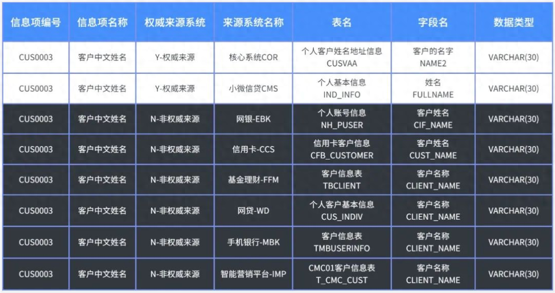 例如,以“客户中文姓名”这一信息项为例,可以顺利获得技术元数据确定数据来源与系统表之间的映射关系。