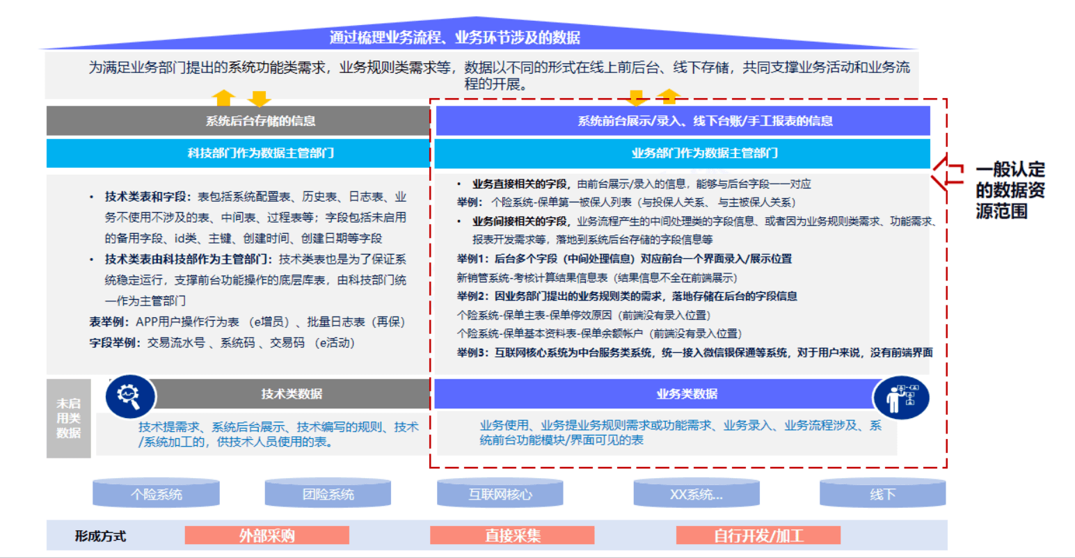 当然这个圈定的过程,可以有很多不同划分的视角,可以圈定一个系统,举例子企业可能有有几十个系统,先大致的摸排比如CRM客户关系管理系统非常重要,要把它纳进来。还可以按照真正的业务类型来划分,举例子哪个部门的数据是比较关键的, 哪个部门的数据可能不是那么关键的,也可以做一轮的排查和划分。