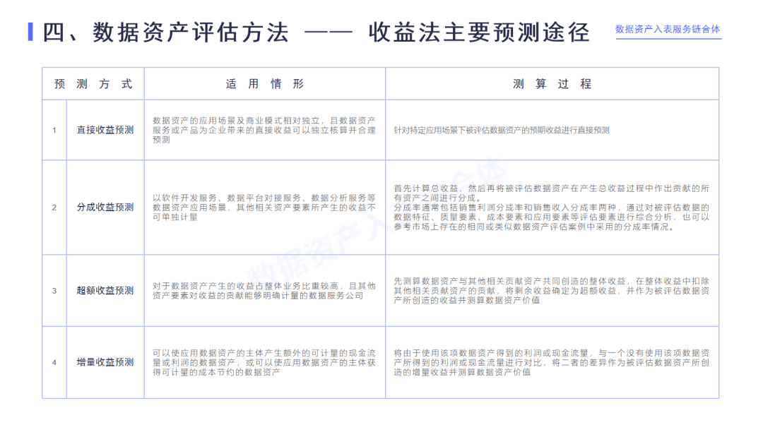 收益法:资产的价值由资产的收益所决定,有四种场景可以判断:直接收益、分层收益、超额收益、增量收益,分别有不同的适用范围。基于现有应用场景的数据资产,总能找到相应的适合收益预测的路径来确定它的价值。