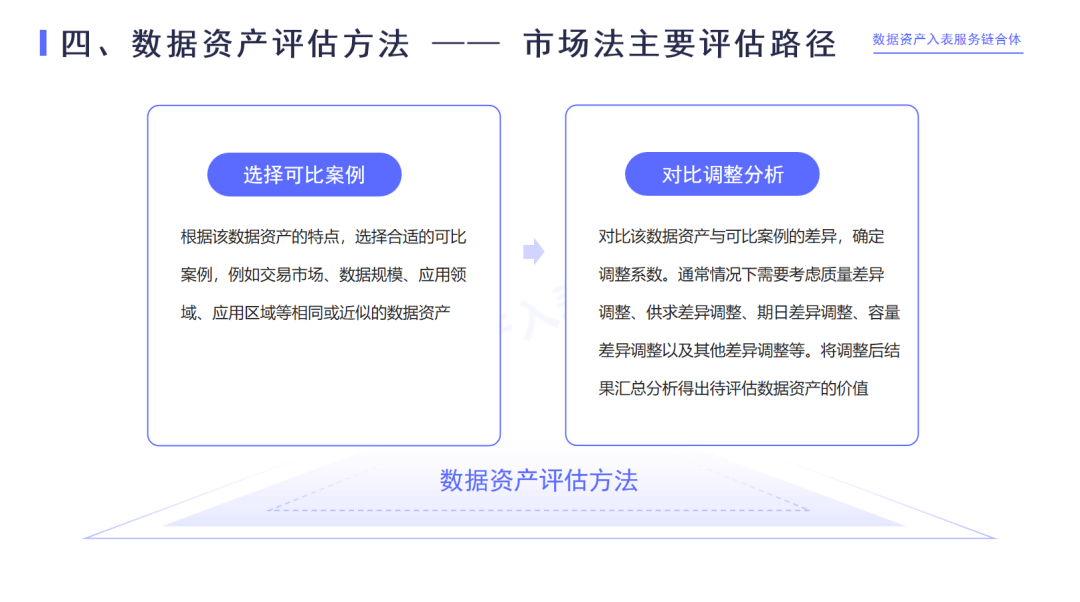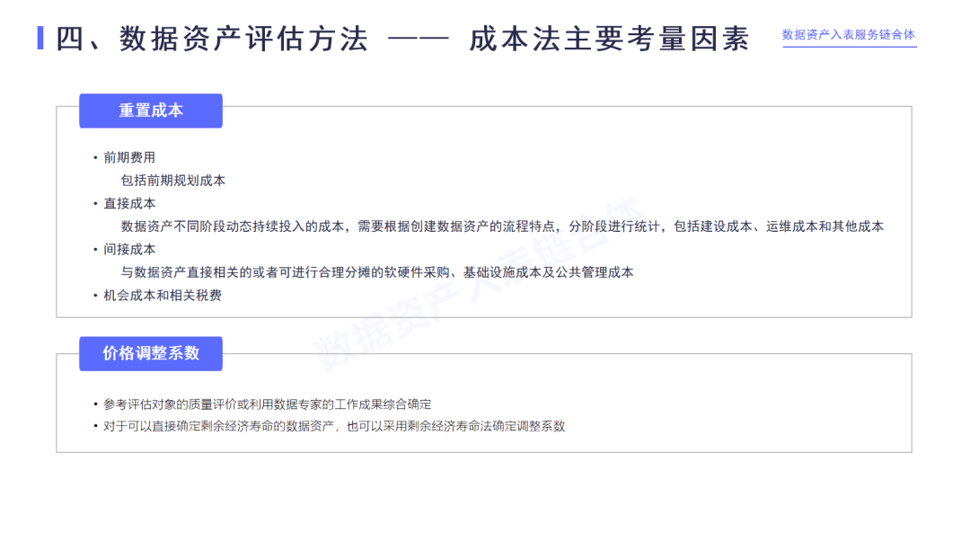 成本法:结合形成数据资产的相关投入,在要评估它价值的时间点,确定现在投入是一个什么样的价格水平,基于重置成本需要进行相应的价格调整。如果前面的重置成本是一个完整年限的数据资产,要进行年限的调整;同时有影响数据资产价值的质量因素,也要进行质量的调整。