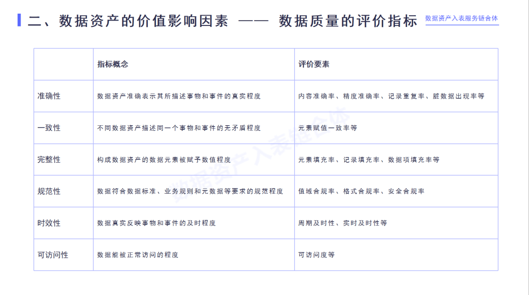 数据质量评价的国家标准,包括六个维度的指标:准确性、一致性、完整性、规范性、时效性和可访问性,这也是数据资产价值评估需要去考量的关键因素。