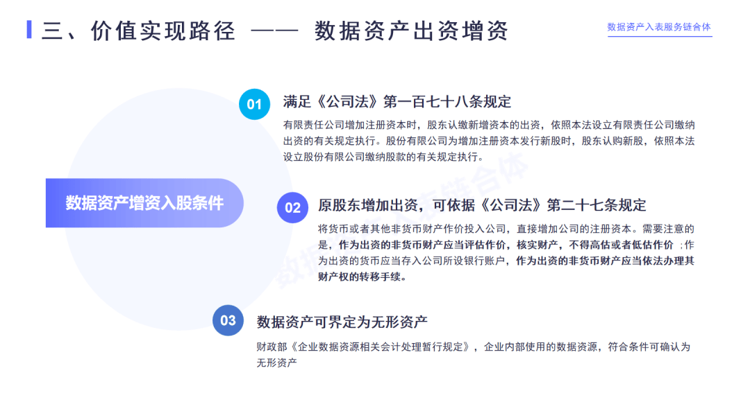 数据资产可以拿当资本金使用,用于出资增资,实现数据入股。自《公司法》修订之后,作为公司出资的资本不再局限于货币资金, 可以以非货币的资产来进行出资。符合一定条件的数据资源已经是数据资产,即使是一个表外资产也具备出资的功能,明年甚至会成为表内资产,也具备出资的功能,因此可以拿数据资产来进行出资。