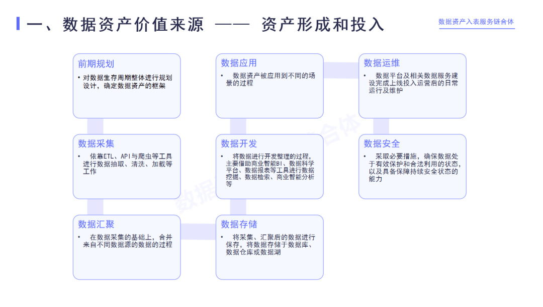 众所周知,形成资产肯定有相应的投入,所有的投入都有相应的价值的,都可以用货币化来体现。也就是说,形成资产实际上是消耗了其他资源的价值才形成了这项资产,实际上是一个资源价值的转化。所以对数据而言,形成数据资产有8个步骤进行相应投入,包括从前期规划到采集、汇聚、