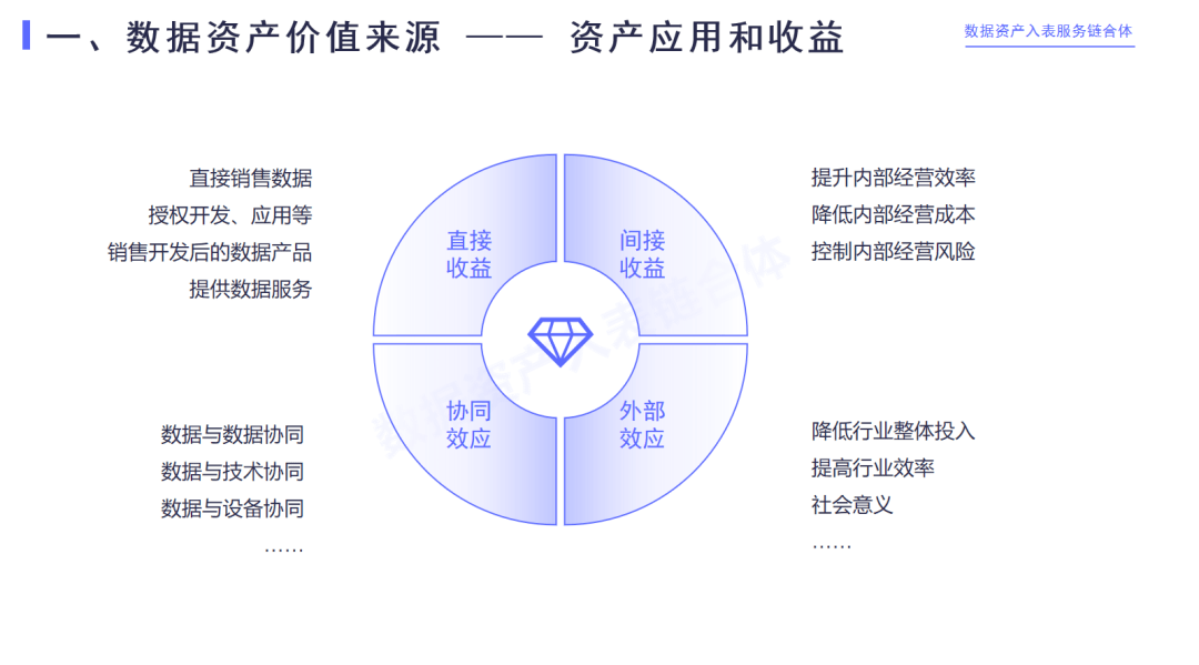 三是协同效应,由单一数据资产所驱动的收益之外,数据还可以和其他的数据、甚至和其他的资产之间产生协同效应。比如经常会看到有数据交易的场景,企业可能缺某一块数据,拿到这块数据之后,就能产生1+1>2的作用。