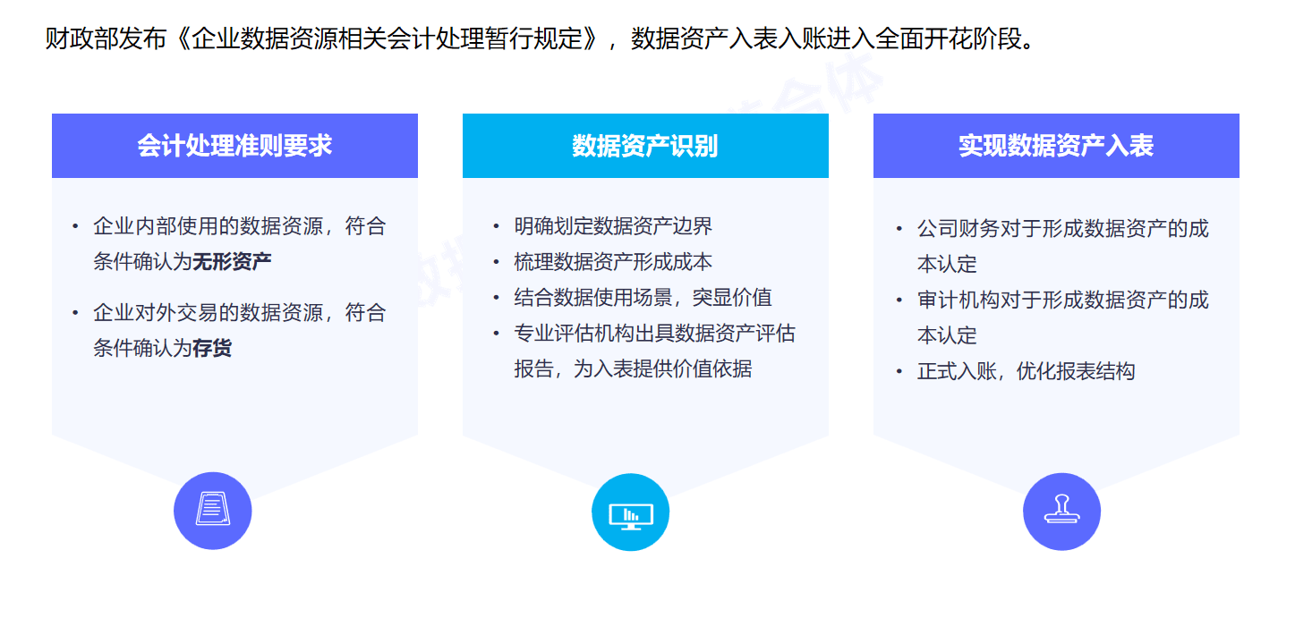8月21号财政部会计师发布《企业数据资源相关处理的暂行规定》,明确企业使用的数据资源符合条件的可以作为无形资产来确认, 以对外交易为目的用于出售的数据资源可以作为存货来确认。也就是说对于拥有数据资源的业主而言,可以不再把这个数据资产当成一个其他的资产来确认,可以把它作为一个数据资源在