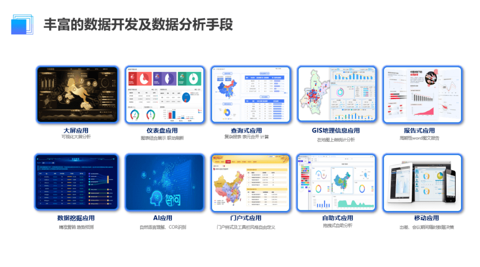 报表分析、领导驾驶舱、可视化地图、敏捷看板(面向业务人员,一分钟上手,满足各类用户对业务数据综合分析需要)、分析报告、幻灯片、智能分析语音交互、移动应用 (无缝对接手机端)。