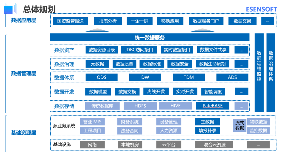 Ebpay对企业数字化转型的总体规划,分为三大层级,从下往上分别是 基础资源层、数据管理层、数据应用层。涵盖的功能可一站式全面解决企业所面临的“资源孤岛”、“一数多源” 、“数据混乱”“