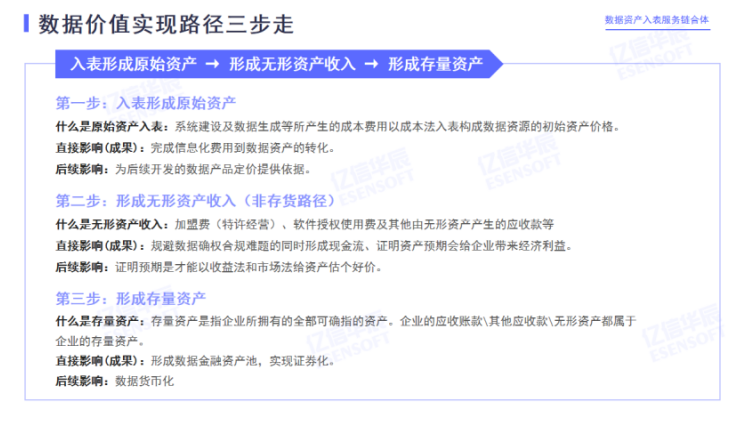 “数据资产入表”是指在企业的会计和财务报告中,将数据资源作为资产进行确认、计量、报告和披露的过程。这是有助于数据资产化的第一步,也是数据要素市场开展的关键一步。它标志着数据资源从单纯的运营资源转变成为企业可以在会计和财务上确认并有效利用的资产,使得数据的价值得以在企业的资产负债表上得到体现,为企业给予了在市场上更准确地展示其资产价值的机会。这一转变为企业带来了新的价值创造和增长机会,同时也成为了拥有丰富数据资源企业在当前阶段的核心任务。
