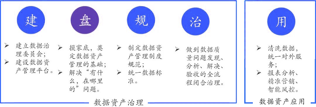 在数据资产管理实践工作中,“建”、“盘”、“规”、“治”、“用”是重要的实践手段和方案。“建”主要指的是建立数据资产管理的相关组织、人员及工具,在“建”的基础上召开数据资产盘点工作,不仅摸清家底,更为后续工作的召开奠定了良好基础。“规”主要指的是建立数据资产管理规范,做到有章可循;“治”主要指的是对数据质量问题的治理,做到事前事中事后全流程治理;“用”是数据资产管理发挥价值的直接体现。“建”、“盘”、“规”“治”、“用”是相互促进的,需要不断循环,提升数据价值。