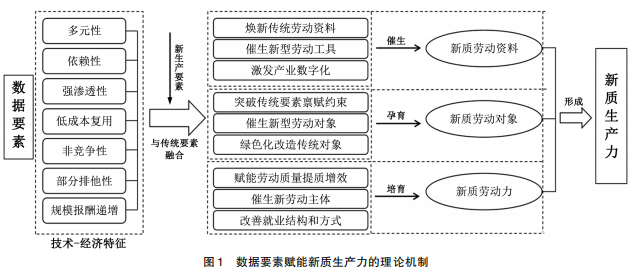数据要素赋能新质生产力是指数据要素因其显著的乘数效应和创新引擎作用,逐渐被认定为新质生产力的核心生产要素。无论是按照生产资料优先增长理论和还是迂回生产理论,随着数字时代资本有组织成的提升,数据作为新型生产要素和重要战略性资源,顺利获得与其他生产要素协同联动并渗透生产、分配、流通、消费各环节,将显著促进生产资料的提质升级,优化产业结构,提升全要素生产率,进而引发生产力的跃迁和经济全场域的颠覆性变革。因此,需系统梳理数据要素赋能新质生产力开展的内在逻辑和重点难点,以更好发挥数据要素潜能,促进颠覆性技术和前沿技术的创新,催生新产业、新模式、新动能,筑牢新质生产力形成的要素根基和动能基础,有助于经济实现高质量开展。