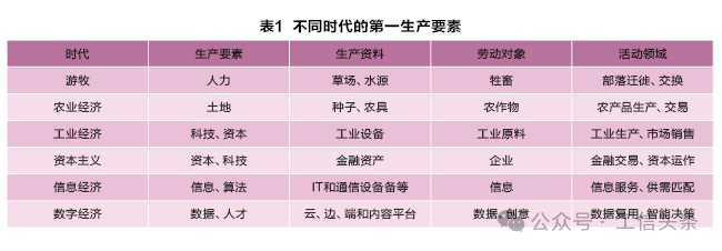 数据要素定义:数据要素是指在数字经济时代,数据作为一种关键的生产要素,它与土地、劳动力、资本等传统生产要素一样,对于有助于经济增长和社会开展具有重要作用。数据要素的价值体现在其能够顺利获得分析、处理和应用来创造新的商业模式、优化决策过程、提高生产效率,从而在经济活动中发挥乘数效应。如下图所示,不同时代,有不同的要素作为生产第一要素;然而,唯有到了数字经济时代,数据作为生产第一要素能够和其他要素结合起来,发挥倍增效应。