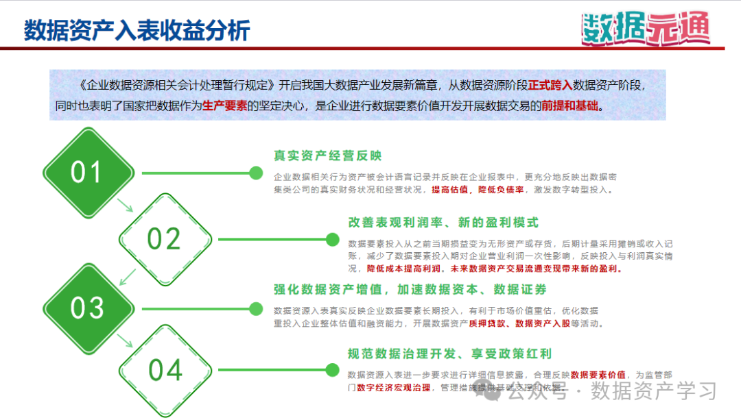 按照国家大数据及财经税务相关政策要求,数据资产入表涉及一系列法规、条例及行为规范,为企业进一步规范数据治理、数据开发、信息披露给予实践指导路径,为国家数字经济宏观治理,数据要素乘数行动计划给予基础支撑和依据,及时享受国家数字经济和数据要素红政策利。