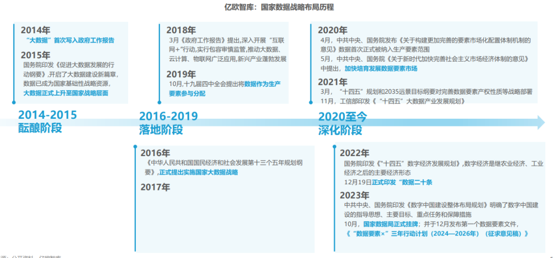 2020年,国务院在“加快完善社会主义市场经济体制的意见”中提出加快培育开展数据要素市场;2021年,《“十四五”规划和2035年远景目标纲要》中,提出要建立健全数据要素市场规则;2022年,国务院正式印发“数据二十条”,从数据产权、;流通交易、收益分配、安全治理四个方面初步搭建我国数据基础制度体系;2023年,10月国家数据局正式挂牌;2024年,发布《“数据要素x”三年行动计划(2024-2026年)》,充分发挥数据要素的放大、叠加、倍增作用,构建以数据为关键要素的数字经济。