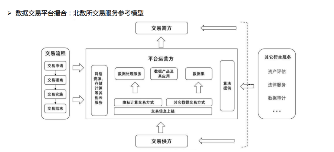 现在,数据交易平台模式尚未形成较为成熟的平台模式,但普遍存在一种线上线下结合的平台交易模式。例如,北数所交易服务参考模型(如下图所示)