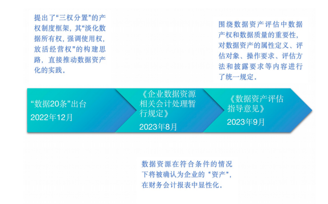 2022年12月国务院出台《关于构建数据基础制度更好发挥数据要素作用的意见》(即“数据二十条”),其作为我国数据要素制度的顶层设计文件,从数据要素确权授权、流通和交易制度以及收益分配等方面对数据资源的合规与监管体系的构建搭建了基础性框架。随后,2023年8月,财政部发布《企业数据资源相关会计处理暂行规定》,初步明确了数据资源的会计处理方式,企业可将数据资源视为其资产负债表上的正式“资产”。该规定的出台标志着数据资产入表在我国正式拉开序幕。同年9月,为进一步规范数据资产评估执业行为,在财政部指导下,中国资产评估协会制定了《数据资产评估指导意见》,制定了数据资产评估、作业、估价及信息揭露的统一标准。