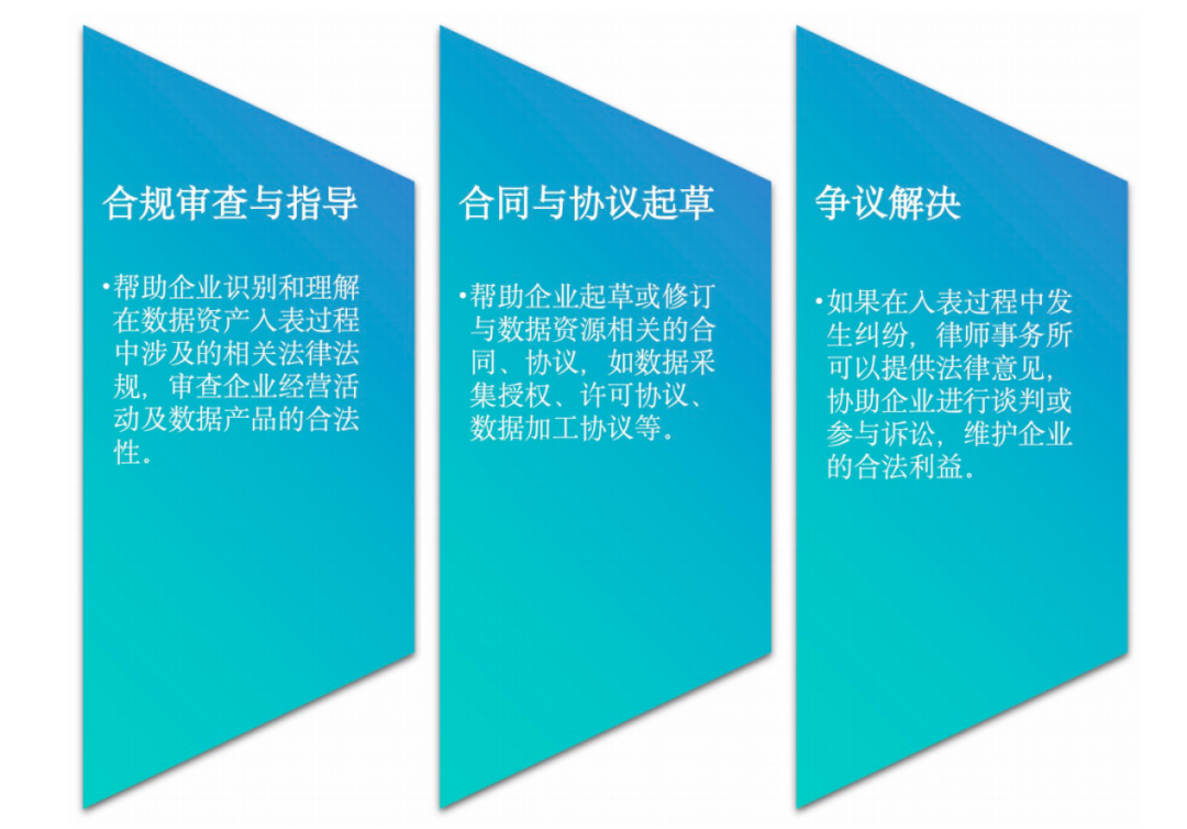 在数据资产入表服务体系中,律师事务所的服务对企业实现合规入表发挥着重要作用,其服务内容通常包括但不限于: